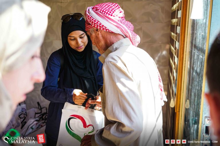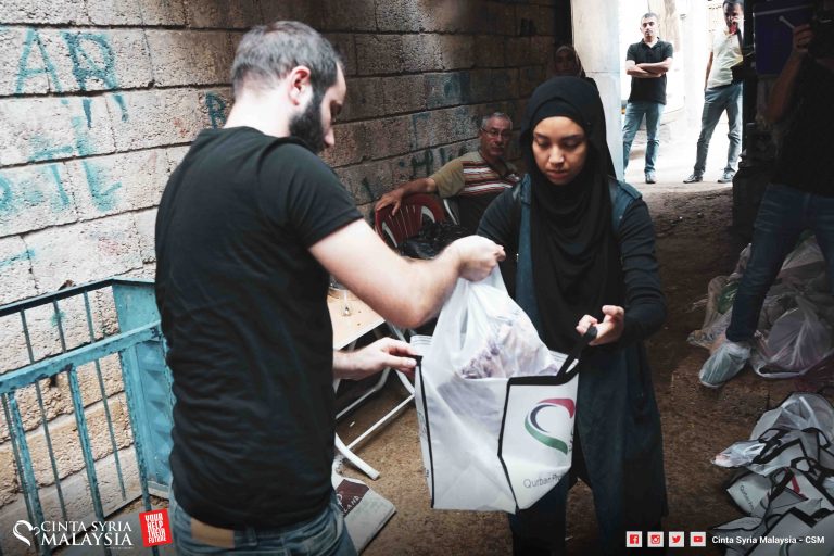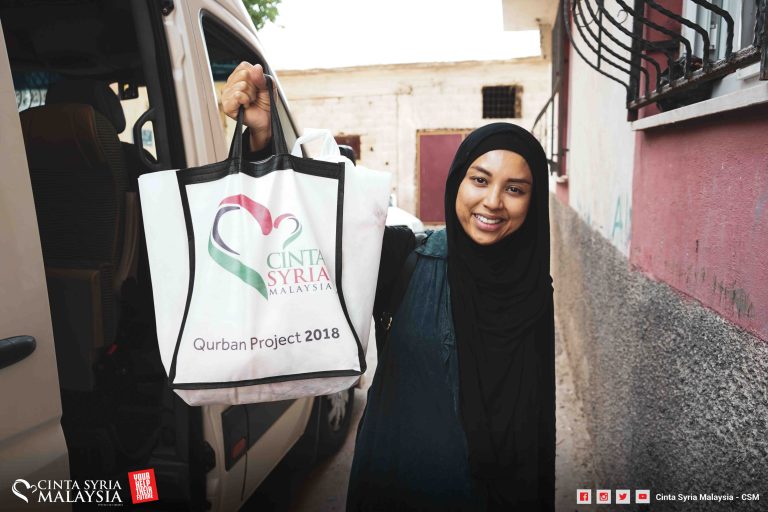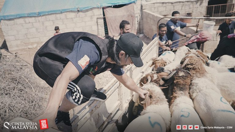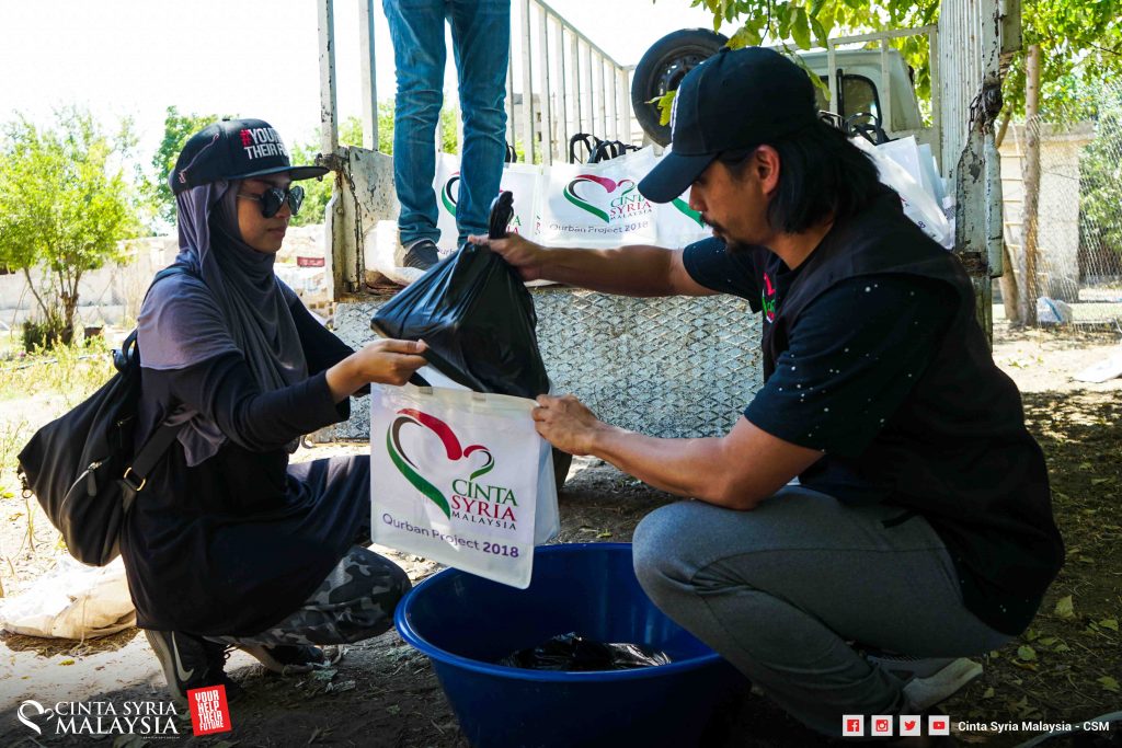 Diketuai oleh Mizz Nina, kambing disembelih, dimasukkan ke dalam plastik lalu diagihkan kepada pelarian Syria di sana.
