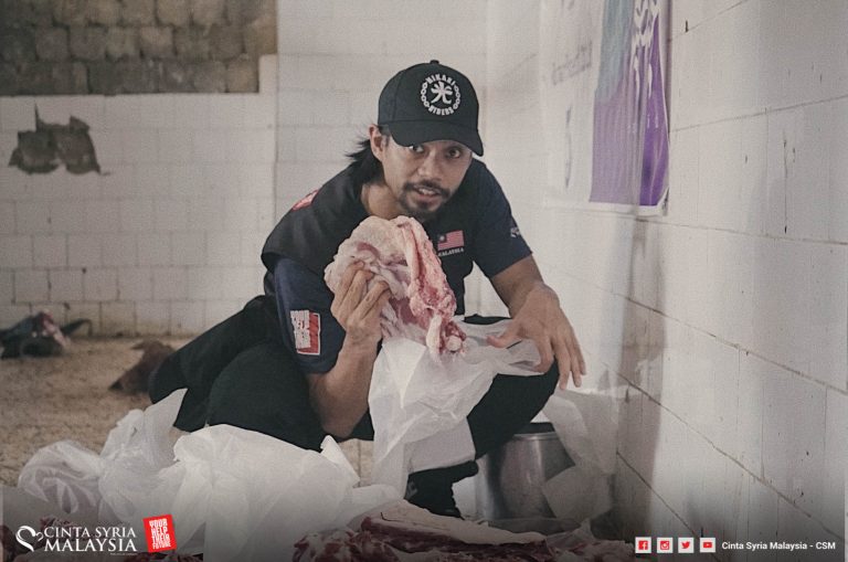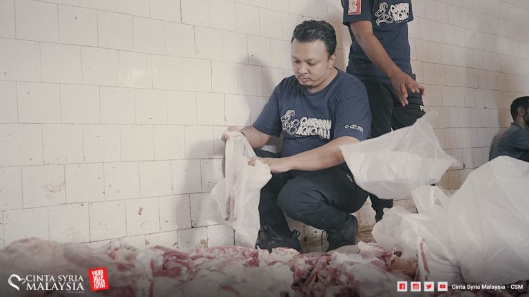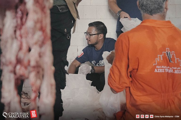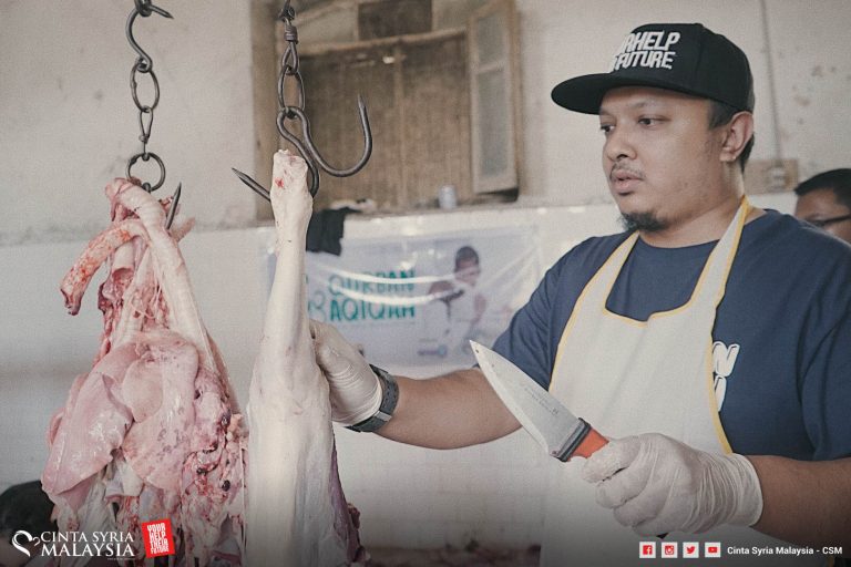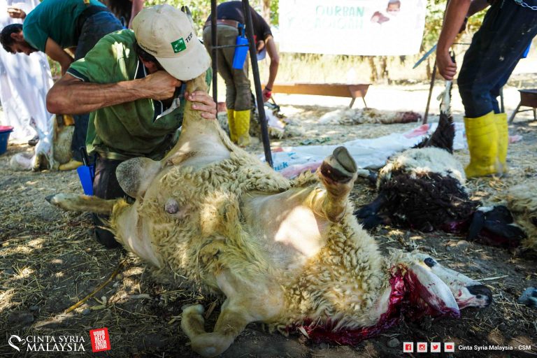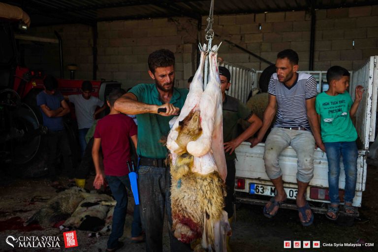 Kali ini penyembelihan dilakukan di kawasan perkampungan, dilapah dan diagih kepada keluarga pelarian Syria di sini.
